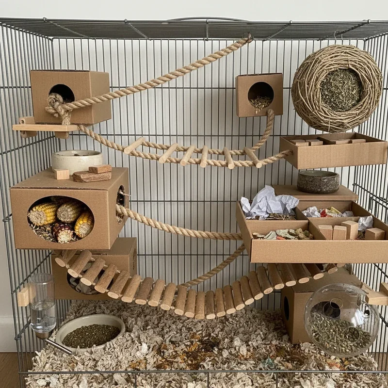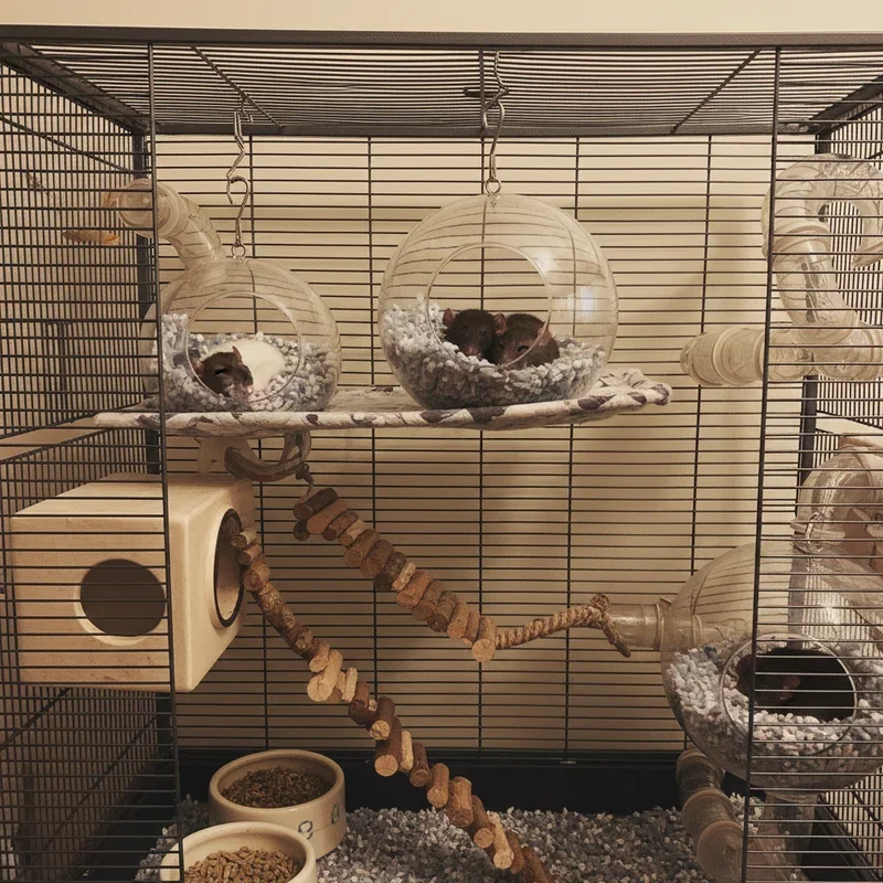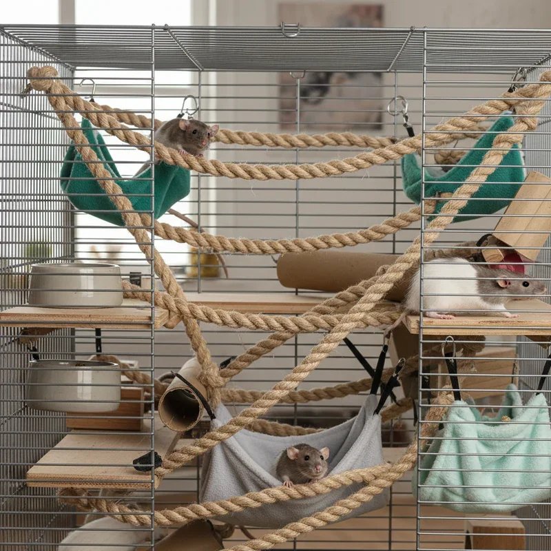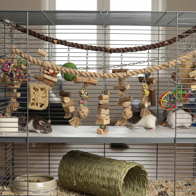 Create an adventurous atmosphere with rope bridges that challenge your rats' balancing skills while providing endless entertainment! These swinging pathways add a dynamic element to the cage that static platforms can't match. Use bird rope perches or make your own with untreated sisal rope, ensuring all materials are safe for chewing. Connect different areas of the cage with bridges at various angles and tensions. Looser bridges provide more challenge and fun, while tighter ones offer security for nervous rats. Add wooden planks or cardboard pieces to bridges for easier crossing options. Your rats' natural curiosity will have them testing different routes and developing their coordination. Watching them navigate these wobbly paths is entertainment for you too! Change bridge configurations monthly to maintain novelty and interest.