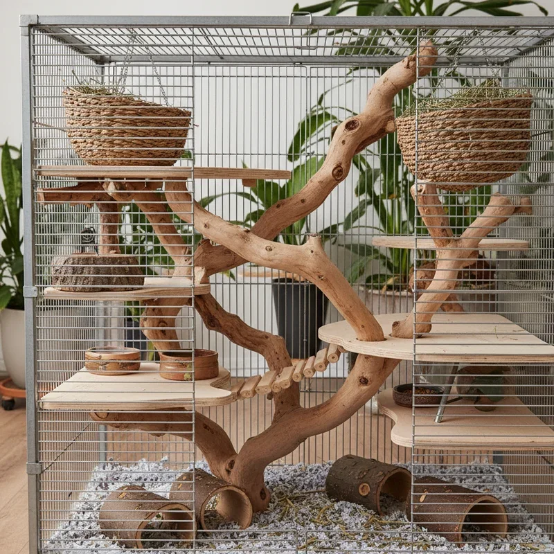 Bring the outdoors inside with natural wood branches that create an organic jungle gym for your rats! Use pesticide-free branches from safe trees like apple, willow, or hazel. Arrange branches horizontally and diagonally throughout the cage, creating natural highways and perches. The varying diameters provide different gripping challenges that improve foot health and coordination. Your rats will love gnawing on branches, which helps maintain healthy teeth. Position branches to connect different cage areas, creating alternative routes to platforms and hammocks. The natural texture provides sensory enrichment lacking in plastic accessories. Change branch arrangements seasonally for variety. Add fake leaves or vines for extra forest vibes. This setup encourages natural behaviors and creates a more stimulating environment than standard cage furniture!