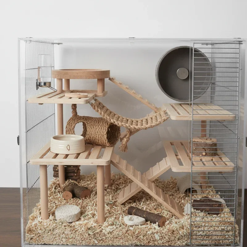 Transform your rat cage into a vertical playground with multiple platforms that maximize every inch of space! Think of it like creating a tiny apartment building where each floor offers different activities and experiences. Install sturdy platforms at various heights using safe materials like kiln-dried wood or powder-coated metal shelves. Your rats will love having different levels to explore, and it naturally encourages exercise as they scamper up and down throughout the day. Create designated areas on each level: maybe the top floor for sleeping, middle for playing, and bottom for eating. Connect platforms with ramps, ladders, or tubes to create multiple pathways. This setup prevents boredom and gives less dominant rats escape routes during playful chases. Cover platforms with fleece or washable fabric for comfort and easy cleaning. Your cage becomes a three-dimensional maze of fun!