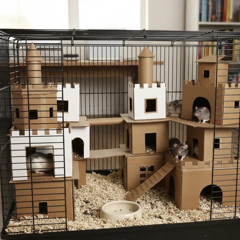 Unleash your creativity and your rats' destruction instincts with elaborate cardboard castles they can explore and eventually demolish! Use non-toxic cardboard boxes, tubes, and sheets to construct multi-room fortresses. Cut doors and windows at various heights for peek-a-boo games and multiple entry points. Connect boxes with cardboard tubes to create a maze-like structure. Your rats will love customizing their castle by chewing new openings and rearranging the architecture. This provides mental stimulation and satisfies their natural gnawing needs. Replace structures as they get destroyed, viewing it as enrichment rather than waste. Add tissue paper or paper towels for nesting material they can shred and arrange. The temporary nature means you can constantly create new designs. Plus, it's basically free entertainment using materials you'd normally recycle!