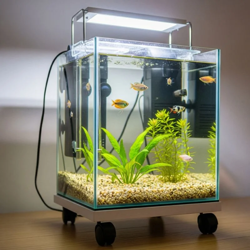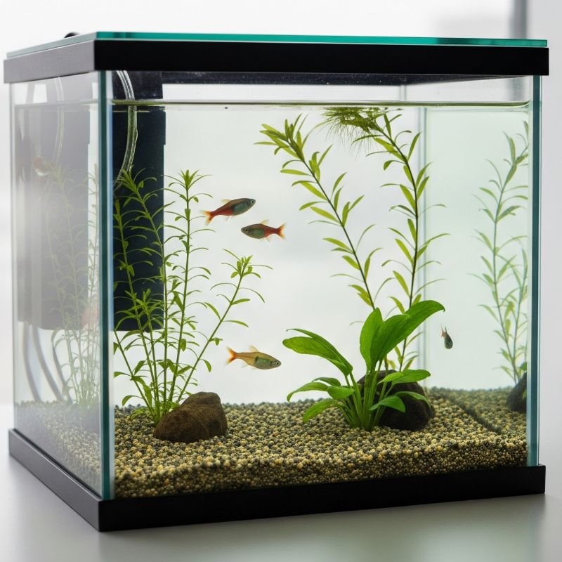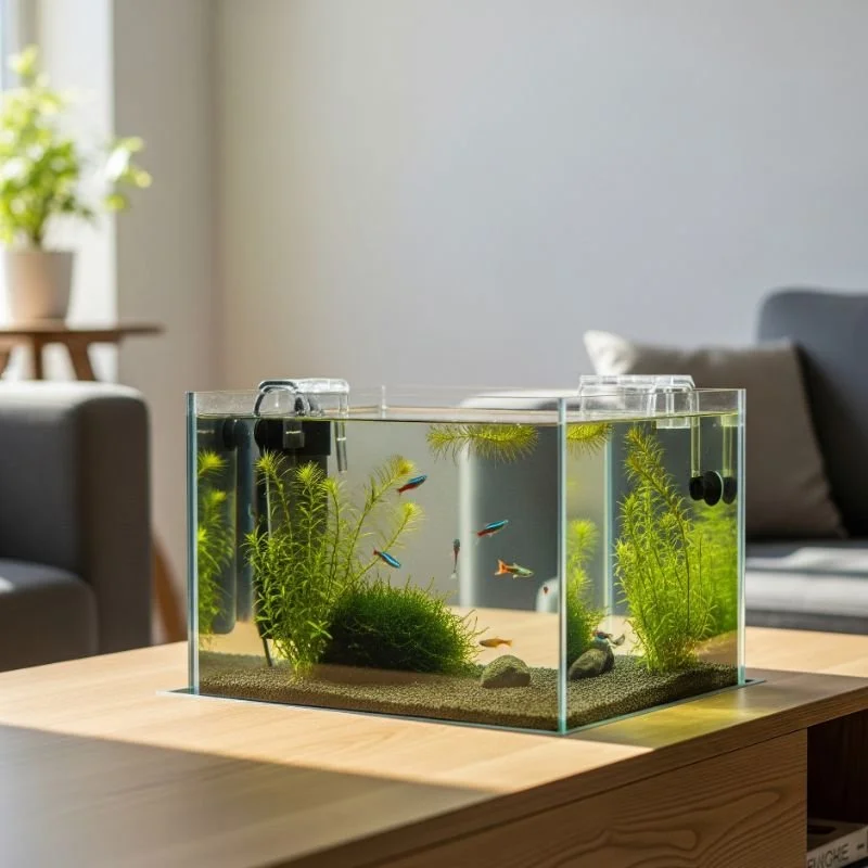 Picture this: a sleek 5-gallon cube sitting on your desk, housing a small school of neon tetras swimming through crystal-clear water. Modern cube tanks come with built-in LED lights and compact filters that whisper quietly while you work. The geometric design saves space while providing enough room for fish to swim comfortably. Choose hardy species like white cloud mountain minnows or endlers that forgive occasional missed feedings. A single piece of driftwood and some moss create an elegant aquascape without cluttering the tank. Maintenance involves topping off evaporated water weekly and a quick filter rinse monthly. The minimal design means less surface area to clean, and the small size makes water changes a breeze. Your coworkers will think you're an aquarium wizard, but you'll know the secret is choosing simplicity over complexity.