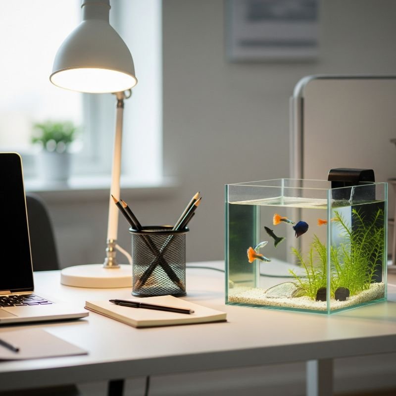 Beat workplace stress with a desktop aquarium that boosts both mood and productivity! A rectangular 6-gallon tank fits perfectly between your monitor and keyboard, providing a calming focal point during busy days. Stock it with active fish like zebra danios or white clouds that provide movement without demanding attention. Include low-light plants like anubias and cryptocoryne that thrive under office lighting. The gentle filter hum masks distracting office noises while oxygenating the water. Studies show watching fish reduces stress and blood pressure, making this a healthy addition to any workspace. Maintenance fits into your lunch break: quick feeding, weekly water top-offs, and monthly filter cleaning. Some offices even make it a team-building activity, with different employees taking turns with care duties.