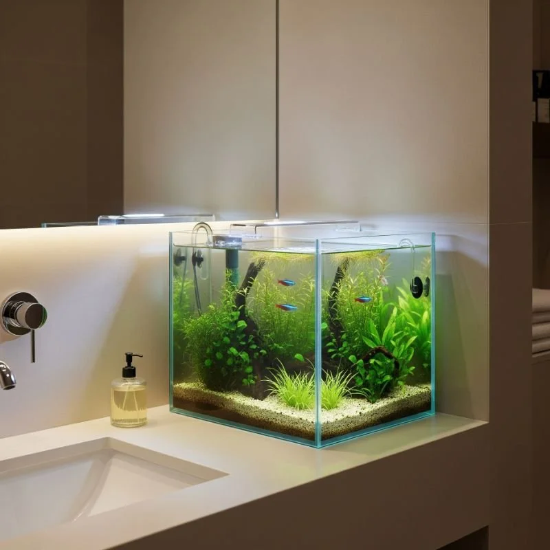 Transform your bathroom into a personal spa retreat with a humidity-loving aquarium setup! The naturally humid environment reduces evaporation, meaning less frequent top-offs. A 8-gallon rimless tank on a waterproof stand creates a zen atmosphere during bath time. Stock it with tropical fish like bettas or gouramis that appreciate the warm, moist air. Add lucky bamboo or pothos with roots in the water and leaves above, creating a natural filter while adding greenery. The bathroom's water source makes maintenance convenient; just siphon old water into the tub during water changes. Choose smooth river rocks and driftwood for a spa-like aesthetic. Some aquarists report their bathroom tanks require the least maintenance due to stable temperatures and humidity. Just ensure adequate ventilation to prevent excessive condensation on tank equipment.