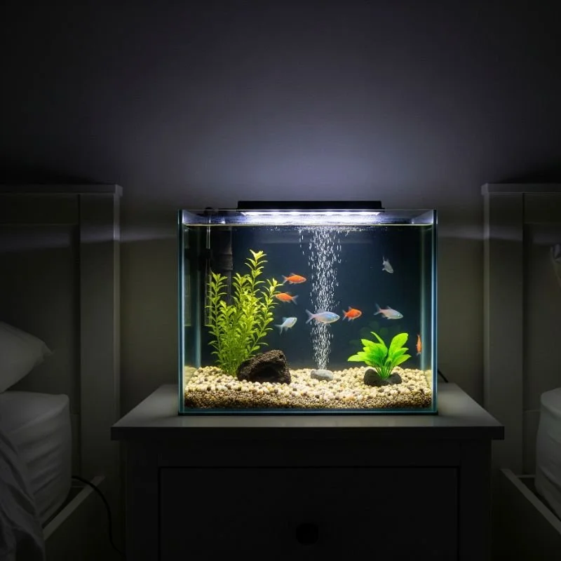 Create a soothing nightlight that's alive! A small 2.5-gallon tank with built-in LED lighting makes the perfect bedroom companion. Choose fish that glow under blue light, like GloFish or cosmic blue rams, for an otherworldly effect. The gentle bubbling of a small filter provides white noise for better sleep while maintaining water quality. Keep decorations simple with dark substrate and a few pieces of dragon stone to make the fish colors pop. Some aquarists add moonlight LEDs that automatically dim at bedtime. Maintenance stays minimal with weekly water top-offs and monthly 20% water changes. The small size means you can perform maintenance without leaving your bedroom. Many people find watching fish before bed more relaxing than scrolling phones, making this setup a healthy addition to your nighttime routine.