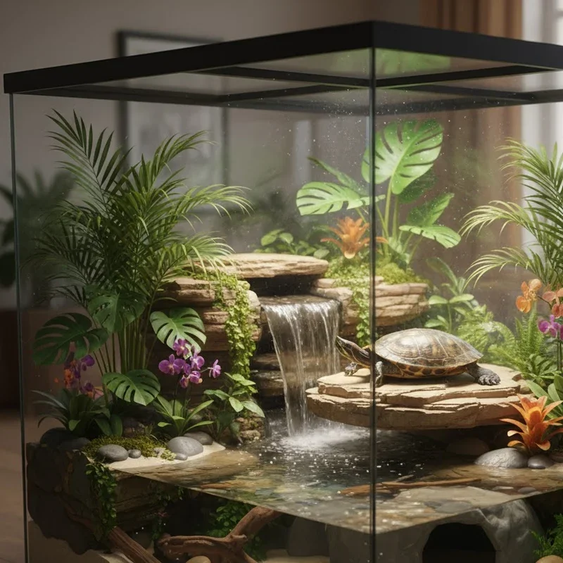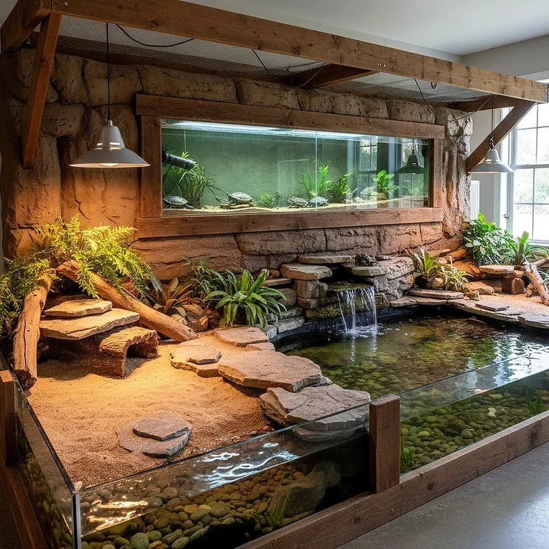 Ever wondered what happens when an aquarium meets a terrarium? You get a paludarium, the ultimate habitat that combines aquatic and terrestrial elements in perfect harmony! This setup recreates the riverbank environments where many turtle species naturally thrive, featuring both deep water sections and lush planted areas. Living moss, ferns, and tropical plants create a miniature rainforest above the waterline, while aquatic plants flourish below. The constant humidity benefits both your turtle's skin and the thriving plant life. Adding a misting system or small waterfall enhances the tropical atmosphere while maintaining optimal humidity levels. This design works wonderfully for species like spotted turtles or wood turtles that split their time between land and water adventures.