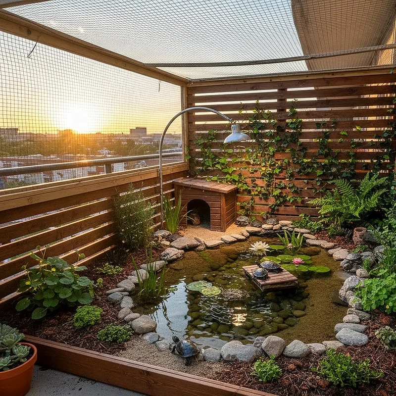 City living doesn't mean sacrificing your turtle's quality of life when you can transform your balcony into a compact outdoor sanctuary! Using weather-resistant containers, you can create a multi-zone habitat that takes advantage of natural sunlight and fresh air. Vertical gardening techniques maximize space, with hanging planters providing shade and visual barriers while potted aquatic plants filter the water naturally. Portable heating elements and removable covers allow for seasonal adjustments, ensuring your turtle stays comfortable year-round. The key is creating a secure environment with proper barriers to prevent escapes or bird attacks. Adding a small solar-powered fountain not only provides water movement but also creates a peaceful ambiance for both you and your shelled companion.