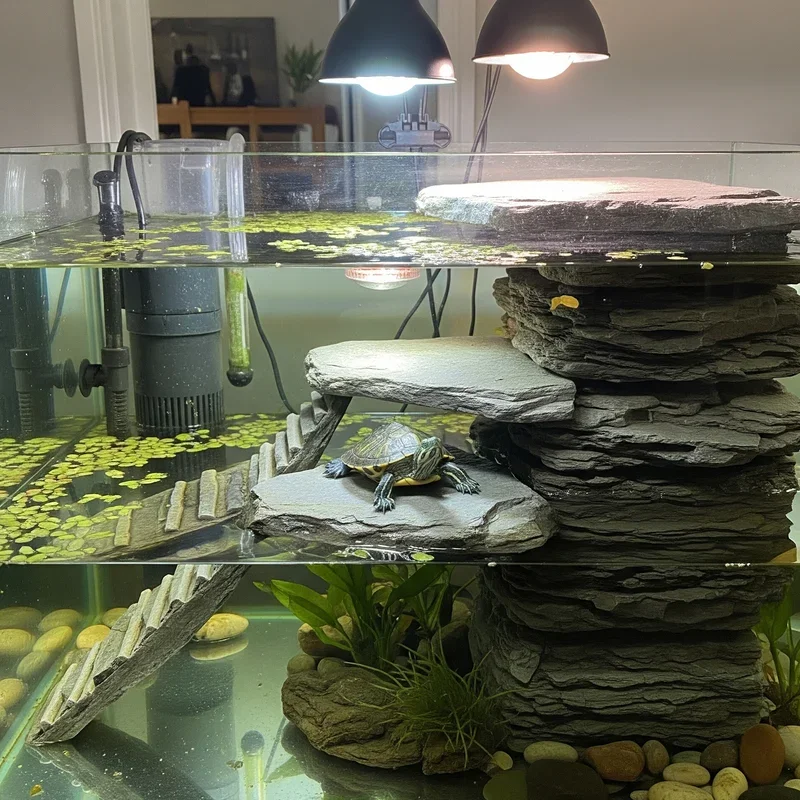 Create a turtle playground with multiple basking levels that mimic natural riverbanks and give your pet options for lounging at different heights. This isn't just one boring platform! Install floating docks at various heights using suction cups or tank-safe adhesive, creating a stairway to turtle heaven. Each level serves different purposes: lower platforms for easy water access, middle zones for semi-dry lounging, and top decks for complete basking under heat lamps. Use materials like cork bark, driftwood, or commercial turtle docks that won't release harmful chemicals. The varied heights encourage natural climbing behaviors and provide exercise opportunities. Position platforms strategically to create shaded areas underneath for turtles seeking cooler spots. Include textured surfaces for better grip when climbing up from water. Your multi-level setup becomes an adventure course that keeps turtles active and engaged throughout their day.
