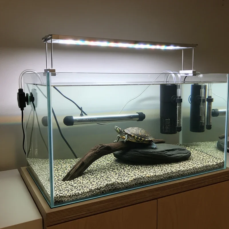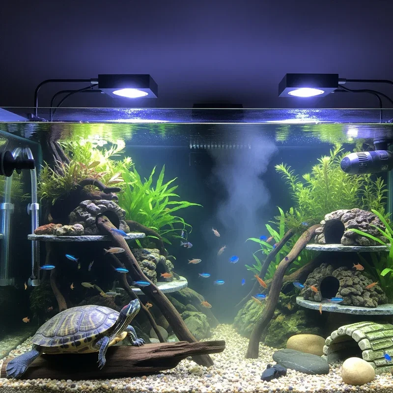Transform your tank into a visual masterpiece with programmable LED systems that enhance viewing while supporting turtle health. Light show extraordinaire! Install RGB LED strips that simulate sunrise, daylight, sunset, and moonlight cycles. Color-changing capabilities create different moods and highlight various tank features. Proper spectrum LEDs support plant growth and provide necessary UVB for shell health. Programmable timers ensure consistent photoperiods without manual intervention. Underwater LED spotlights create dramatic effects highlighting caves or decorations. The low heat output prevents overheating while reducing electricity costs. Night viewing modes allow observation without disturbing turtle sleep cycles. Your LED setup becomes a customizable lighting system that makes your tank a living work of art.