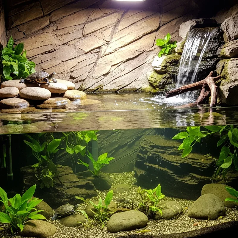 Add a waterfall feature that provides constant water movement, improved oxygenation, and soothing sounds that benefit both turtles and owners. Nature's soundtrack included! Install submersible pumps connected to rock formations or commercial waterfall decorations. The falling water increases dissolved oxygen levels, promoting healthier aquatic environments. Current created by waterfalls encourages swimming exercise and natural behaviors. The sound masks household noises that might stress sensitive turtles. Position waterfalls over basking areas for drinking water access without entering pools. Use foam backgrounds to create realistic rock faces with integrated water channels. Adjustable flow rates accommodate different turtle species' preferences for water movement. Your waterfall becomes a focal point that transforms static tanks into dynamic aquatic landscapes.
